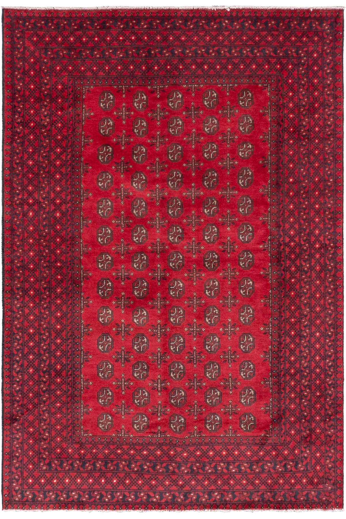 Elevate your space with the timeless beauty of this Afghan Aghche hand-knotted rug, crafted by skilled tribal weavers using traditional techniques. Featuring a deep ruby-red field enriched with classic Aghche gul motifs and finely spaced geometric filler elements, this rug brings warmth, depth, and unmistakable Afghan character to any room.