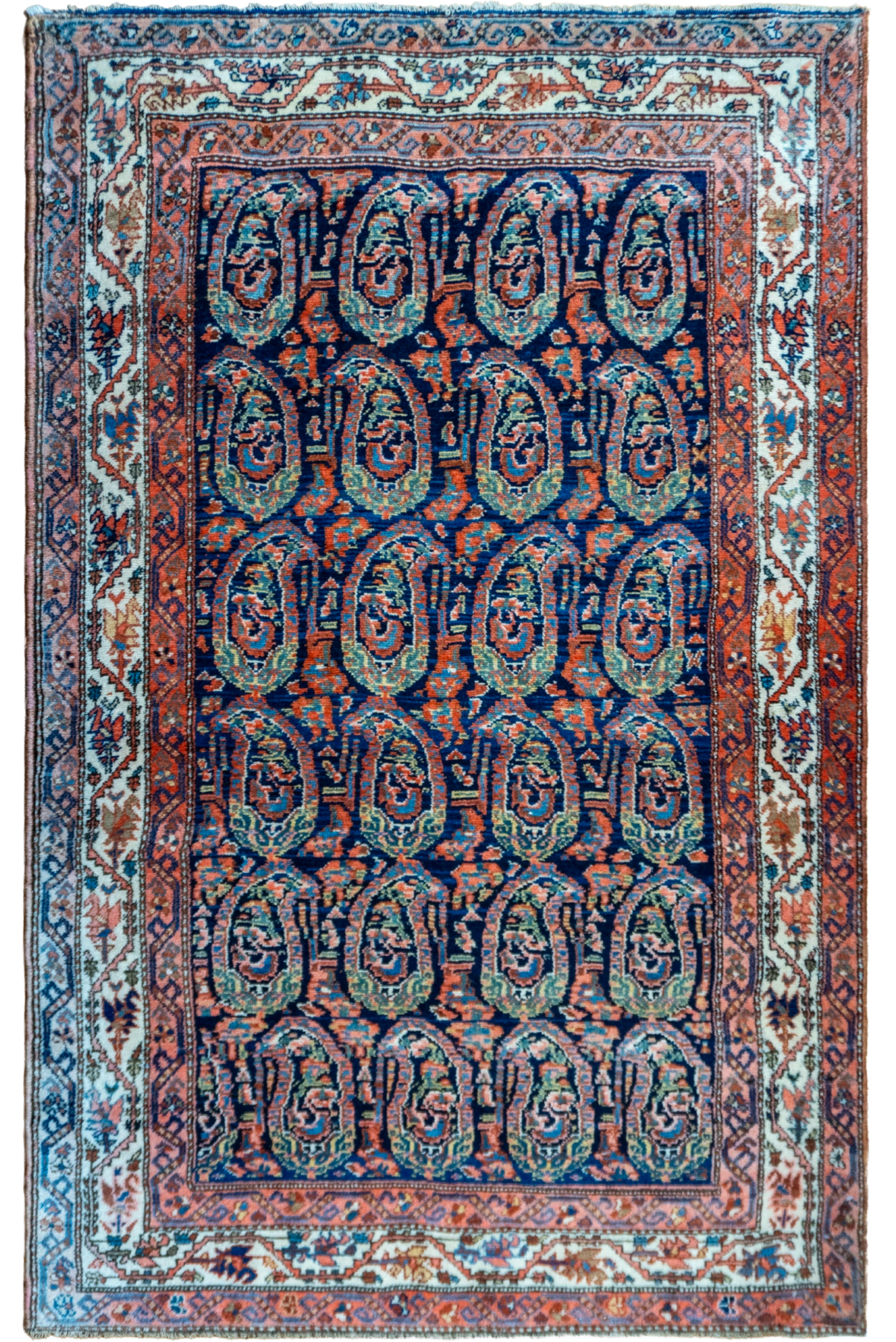 These rugs are quite durably constructed due to the rugged wool spun from hardy sheep in the higher, cooler altitudes. The patterns vary in rugs from this city from geometric, to small animal and floral elements and sometimes the famous “herati” design. The foundation of the rug (warp and weft) is usually cotton and the patterns are usually simple geometric arrangements with primary and vibrant colours. The colours are dominated by different nuances of indigo blue and madder red. These rugs are overall very good in quality and most of them have been known to last surprisingly long periods of time.