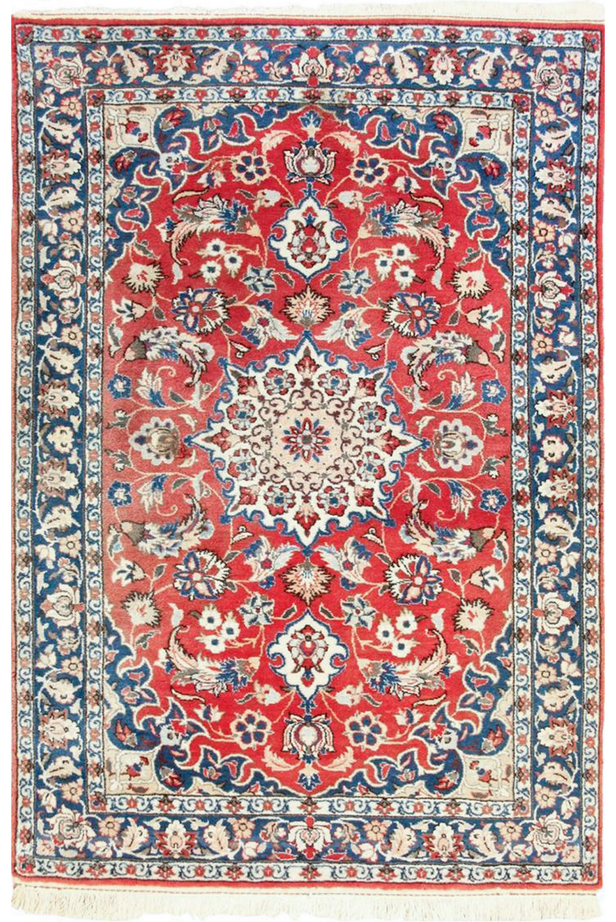 Isfahan rugs and carpets are very symmetrical and balanced and usually have a single medallion surrounded with whorls (vines) which is sometimes called a Floral Medallion design. Isfahan rugs are among the finest quality carpets in the world using oriental knots, soft wool and a very tight weave. The finer Isfahans have silk foundations and wool and silk piles. Isfahan rugs and carpets usually have ivory or red backgrounds with blue, rose, and indigo motifs. Isfahan rugs are a great investment and for centuries have been treasured in the east and in Europe - sure to appreciate in the future.