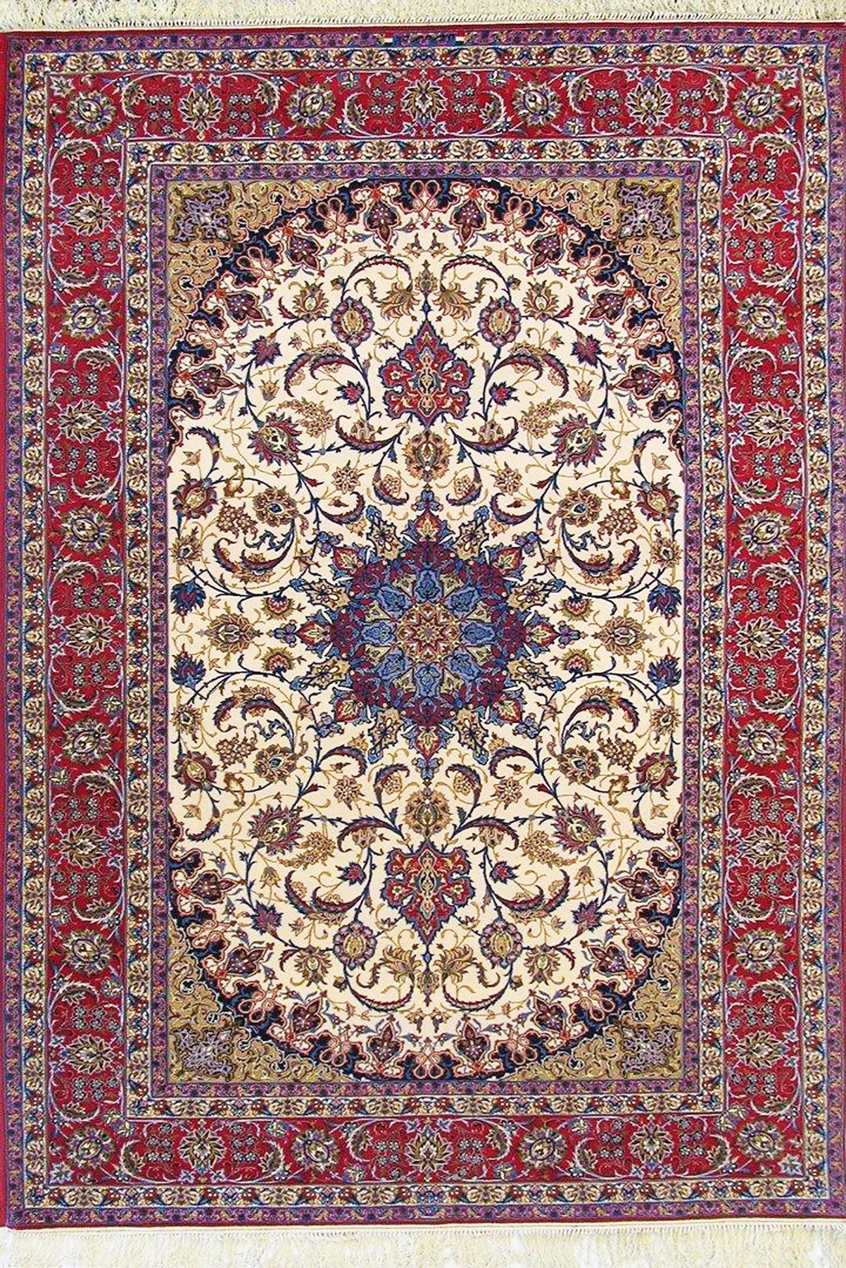 Isfahan rugs and carpets are very symmetrical and balanced and usually have a single medallion surrounded with whorls (vines) which is sometimes called a Floral Medallion design. Isfahan rugs are among the finest quality carpets in the world using Oriental knots, soft wool and very tight weave. The finer Isfahans have silk foundation and wool and silk pile. Isfahan rugs and carpets usually have ivory or red backgrounds with blue, rose, and indigo motifs. Isfahan rugs are a great investment and for centuries have been treasured in the east and in Europe - sure to appreciate in the future.