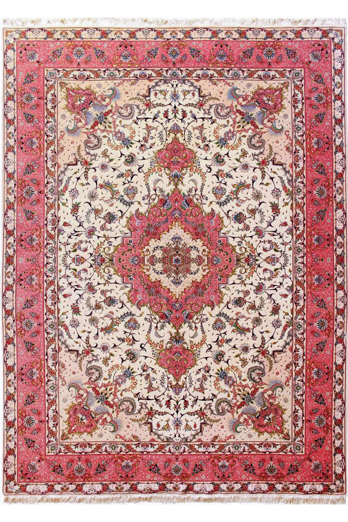 Tabriz, the town where this rug was made, is today one of the chief centres of rug making. Many Tabriz rugs have animal, hunting, medallion, geometric and floral patterns. Tabriz rugs come in both bold and contrasting colours, such as dark red and powerful blues with ivory, as well as soft and subtle colours like soft green, blue, pink and brown (typically found in new carpets). The quality and price of the Tabriz rug varies depending upon the density of knots. The finer weaved Tabriz rugs and carpets are made using a blend of Kurk wool (from the neck of lambs) and silk. They are highly prized because they are one of the best-looking and finest quality carpets in the world.