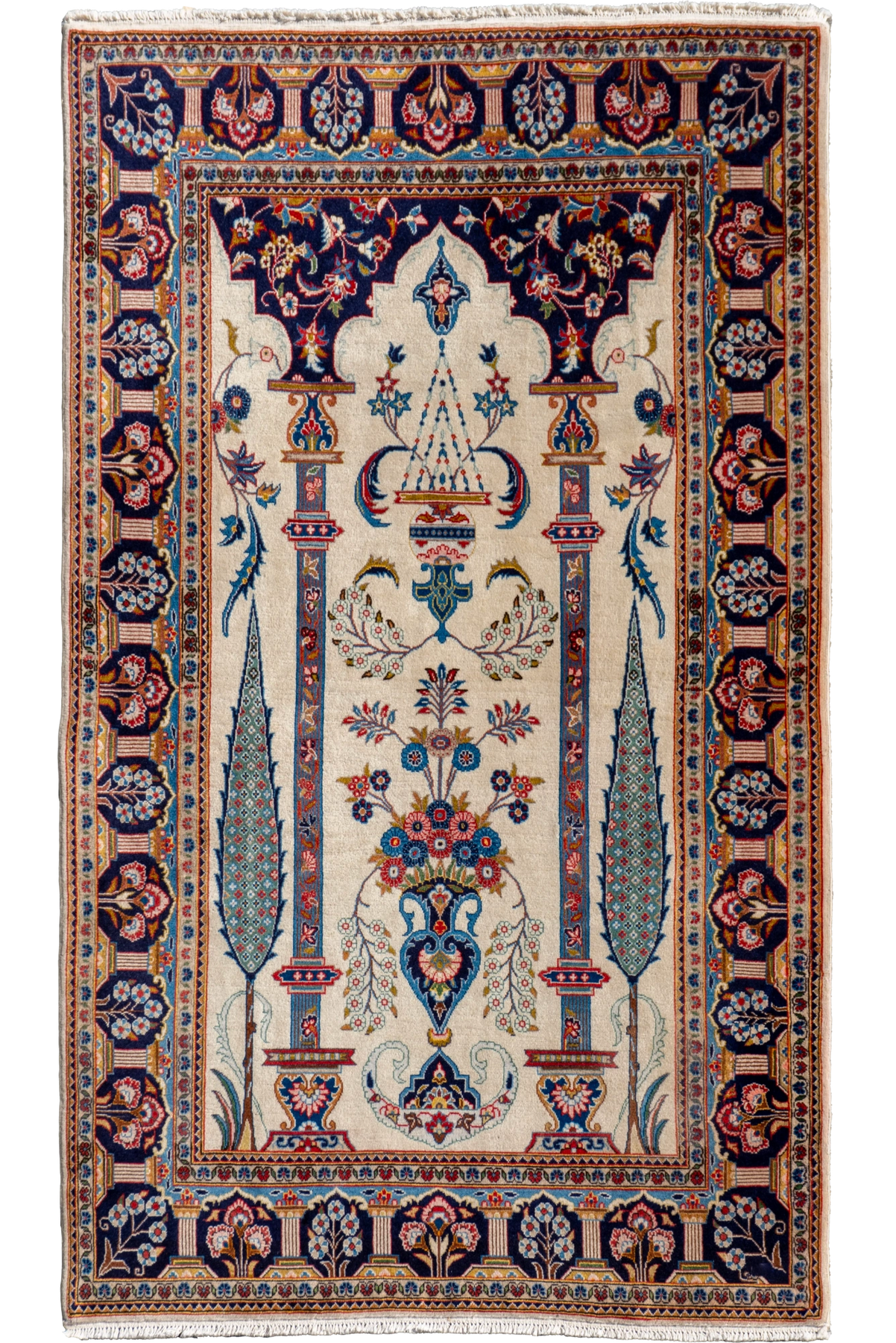 Kashan rugs all have similar patterns, a single medallion in the center and floral motifs. Kashan rugs and carpets are of excellent quality, and are made from good quality wool, often using kurk wool (from the neck of lambs) and are one of the finest looking carpets in the world. Kashan carpets and rugs have the greatest curvature and visibility among those of the cities in the central oriental region. The main colours are ivory, light green and red predominate. Other colours such as soft green and blue are found in newer carpets. Kashans are becoming increasingly difficult to find and acquire. Master Weaves of this quality are highly collectable and in high demand.