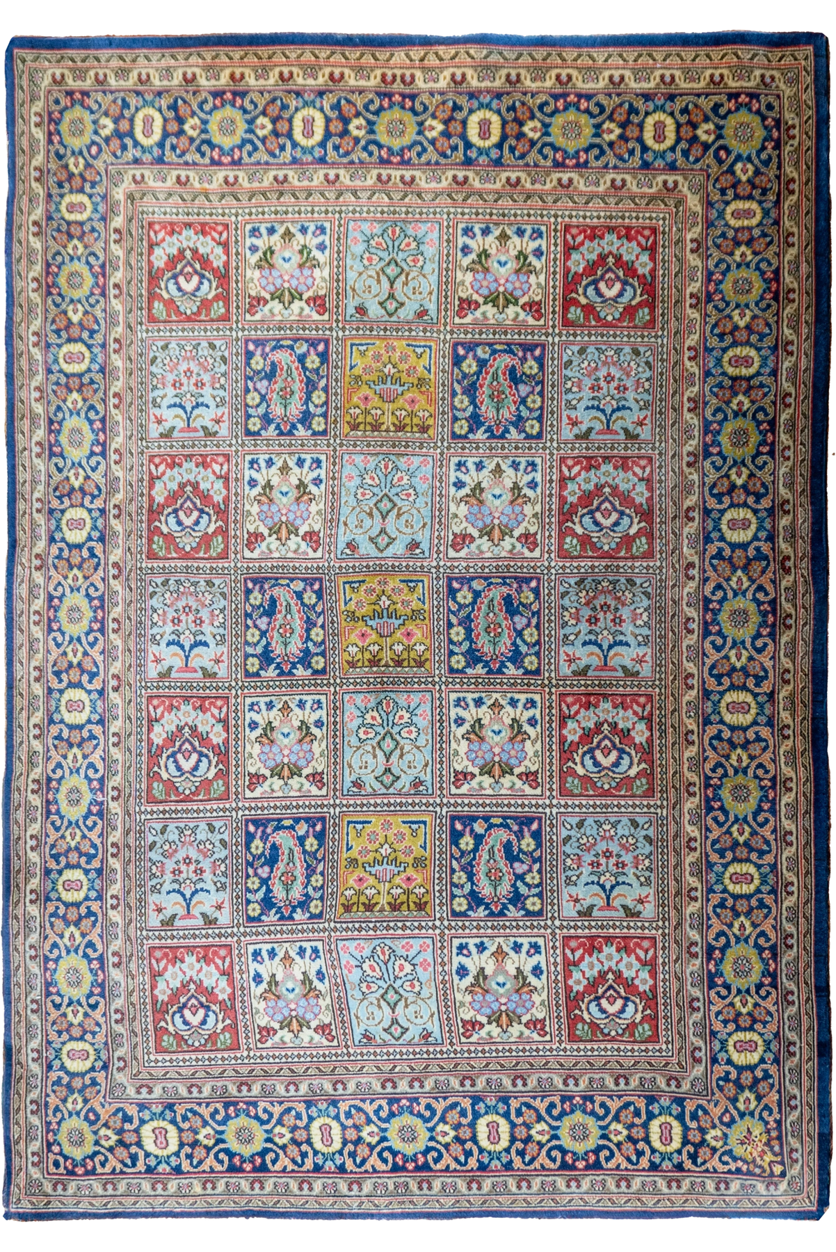 DESCRIPTION: Kum rugs and carpets, have an excellent visage. The majority are small, very fine, and beautiful to look at; therefore many people use them as wall hangings. The patterns are usually highly curvilinear (city style), but they sometimes depict landscape features or historical stories. Kum rugs and carpets come in a variety colours (red, blue, and ivory are very common) and usually have a dense weave pile made of Kork wool. Kum rugs are among the finest and most beautiful rugs in the world